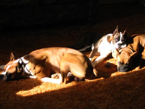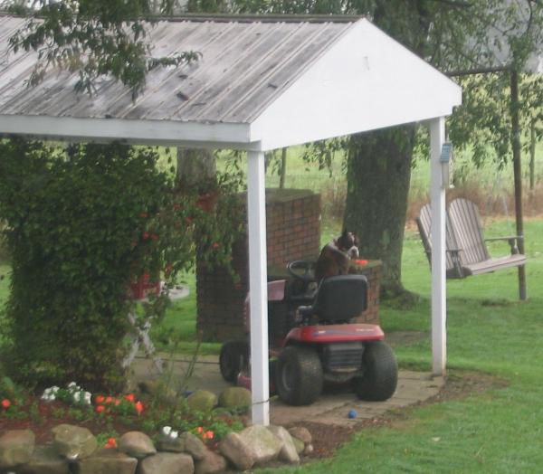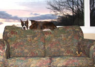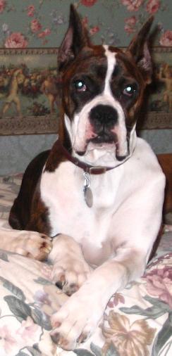 Calamity is a flashy reverse brindle. What is there to say about Cammy Jane? In one word, eccentric. Calamity likes to think she is in control. She has perfected the "what are you looking at?" look. She is a sweet girl, but very protective and hence can be vocal when the mood strikes. Calamity loves to sit on your lap and be spoken to in soothing tones. Her favorite game is to instigate and stir up a game of boxing. Cammy pretty much does what she wants whether it be to sit on the lawn mower or act like a cat (see below). But, at the end of the day, she snuggles in with the other boxers and gets ready for another round. *Calamity Jane has been retired from breeding* |