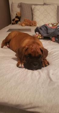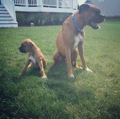 | Hi Donna. Just wanted to provide you with an update on Apache...now known as Sarge. To be honest, we were a bit nervous bringing him home as we already have our four year old male Boxer, Champ. We were pretty protective of Sarge the first day. Champ was VERY interested in his new brother and quite tense. We decided to involve a trainer at our local Kennel as we wanted a smooth transition. She met with us on the second day and we all became more relaxed. She really didn't have to intervene at all and the pups became acquainted on their own. Champ is very accepting of Sarge and loves to play...even shares his toys without issue. I think he enjoys having a frisky puppy around. Sarge is exploring his new home and we are just in love with him. He has the sweetest personality. |